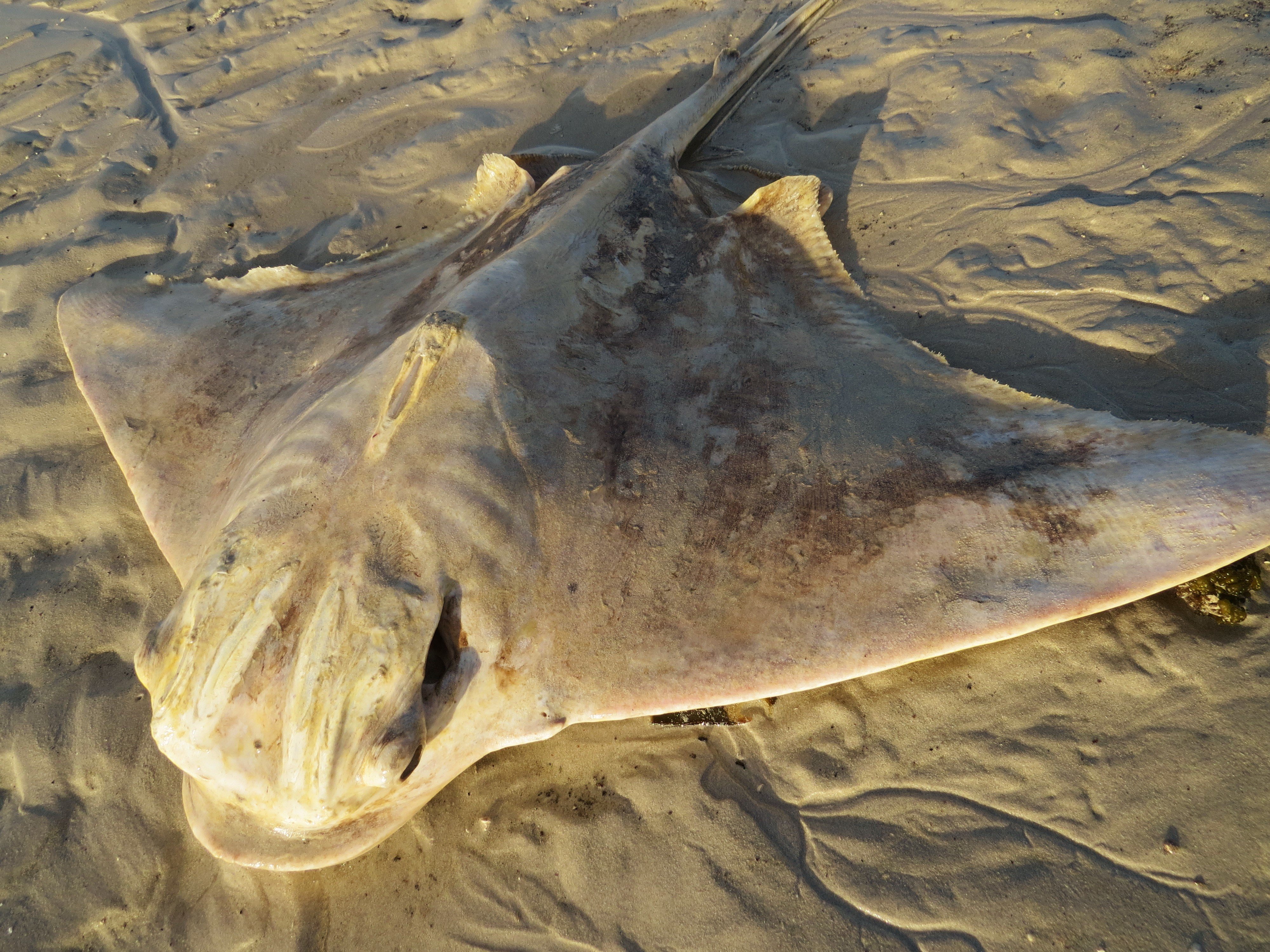 An unusual find in Pearly Beach was this Eagle Ray (Myliobatis aquila) washed up near blue water bay. Eagle rays are semipelagic found inshore and offshore from North Eastern Atlantic around to Kenya. They feed on molluscs, bottom-living crustaceans and small fishes, grinding prey on a series of 7 flat tooth plates called pavement teeth, useful to crush clam shells and crustaceans. Its protection comes from 2 barbed venomous spines on the tail which can be extremely painful if embedded deep into your leg! This may only occur if the animal is trodden on or tampered with.