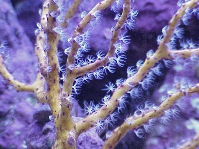 The sea fan grows below the wave surge but across the prevailing current presenting a large surface area maximising water flow so each animal polyp can feed on the suspended plankton and other particles using their eight tentacles which protrude from the often brightly coloured jelly like substance coating the stem.
