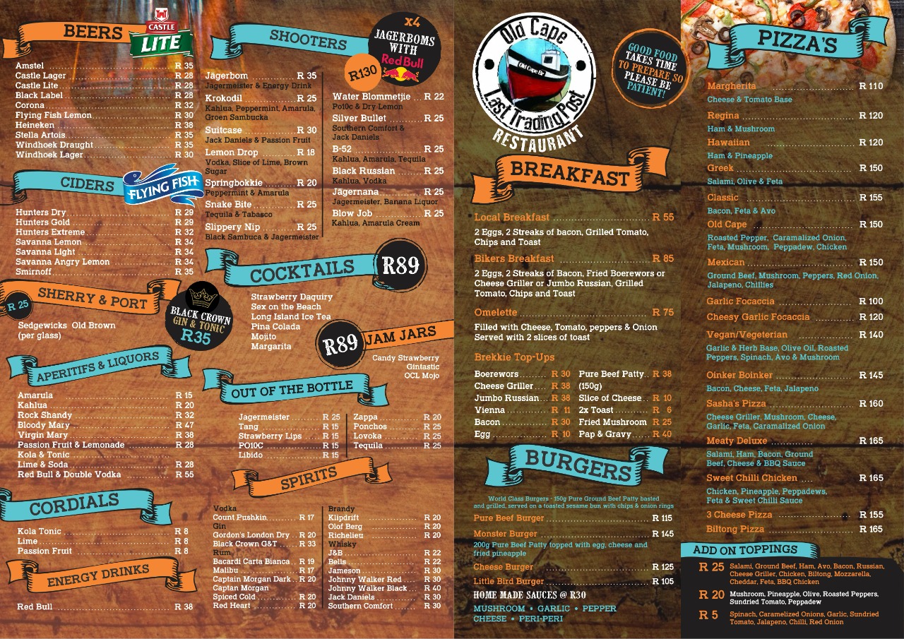 Old Cape Last Trading Post is a family-friendly restaurant in Struisbaai open for breakfast, lunch and dinner from Monday to Sunday. If you are in search of a hearty all-day breakfast or a delicious light lunch prepared with wholesome ingredients, Old Cape Last Trading Post serves delicious goodness...