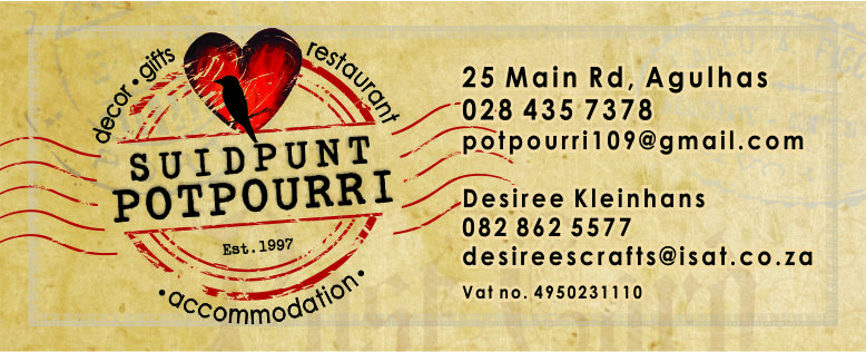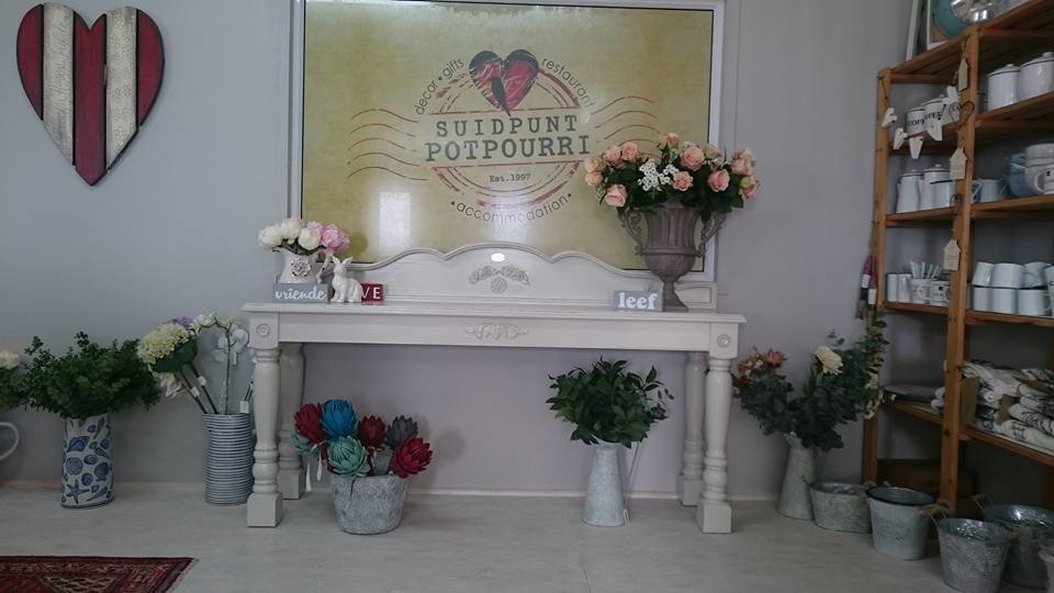 Whether it's a gift you need or simply want to spoil yourself or a loved one, Suidpunt Potpourri has all that you could dream of, from gifts to jewellery and many more items. The coffee shop offers a variety of mouth watering cakes and fresh lunches and breakfast. Also fully licenced. Open every day 9am-5pm.