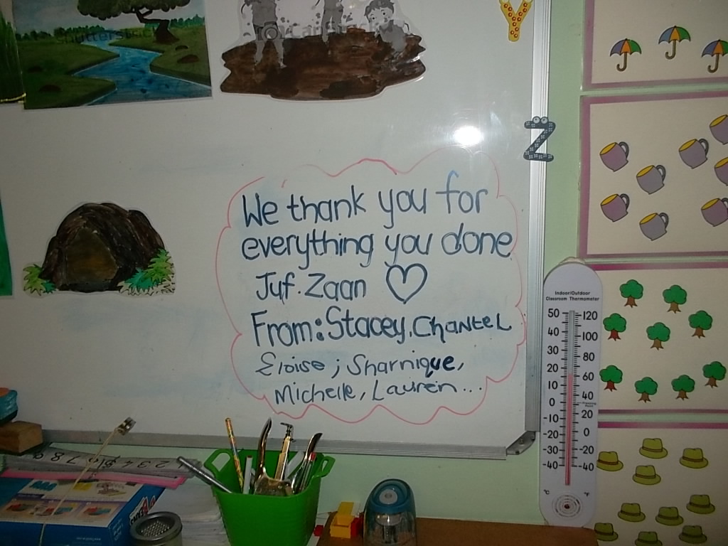 1. Juffrou Zaan was very touched the other day to come into her classroom and find that girls in her class had written her a note with the help of Tannie Genevieve.