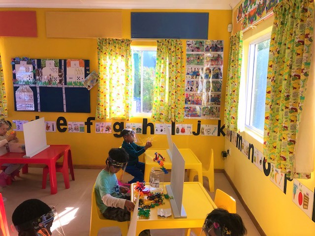 All the toys have been sanitised and are kept that way in sealed boxes. To prevent the children from using items from one another’s boxes as well as to keep them apart, the school has put dividers on each table which Zaan painted and Sandra decorated most beautifully with stencils.