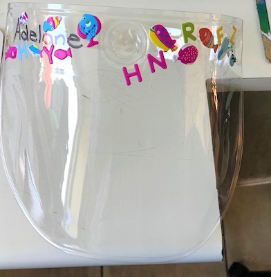 They each have two masks made for them by the ‘Rooi Els Maskers’ which they wear when they are out and about but they fiddle with them so much when they are in the classroom it was decided it was safer to provide them with shields which can be sanitised. Each one has the owner’s name on it so there is no sharing.