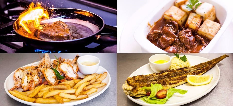 South African Dishes: Ribs, t-bones & rump steaks, sole, kingklip, calamari.
