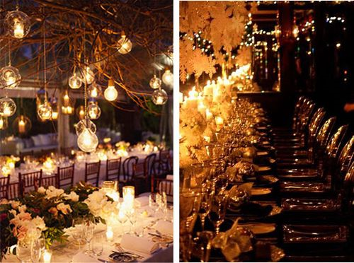 If the weather is just too extreme for utilizing the great outdoors, an indoor reception can still have a romantic starry night vibe wih Faiy Lights, Naked Bulbs and a glowing fireplace.