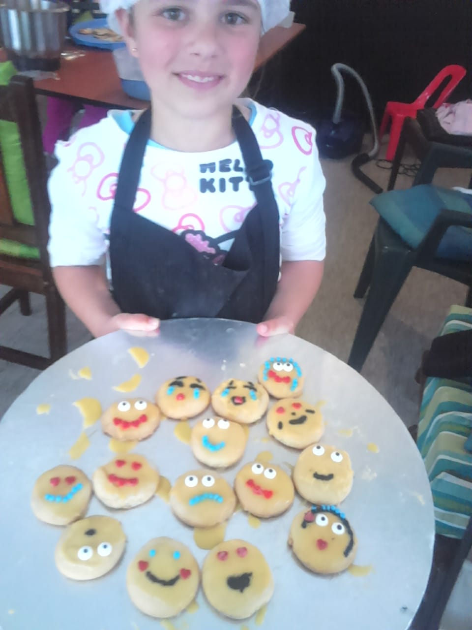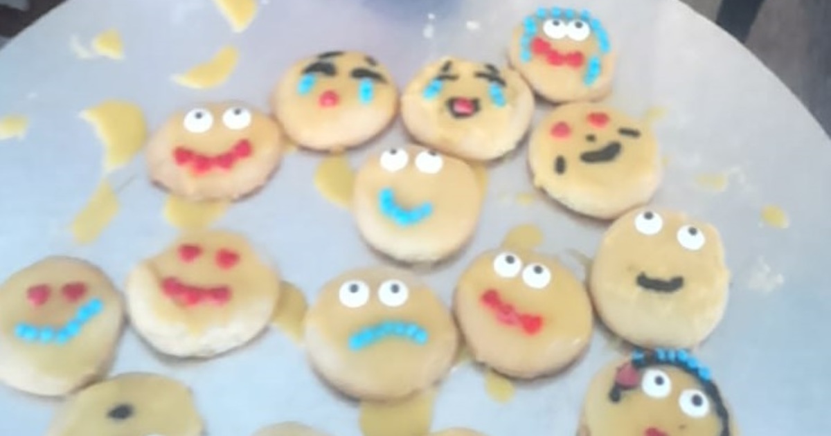 Kiddies at birthday party making cookies with emojis on.