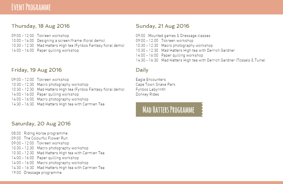 This includes the Fynbos Mountain, Mad Hatters High Party, CFK Pop-up Shop, Guru Bookshop and Flea Market.