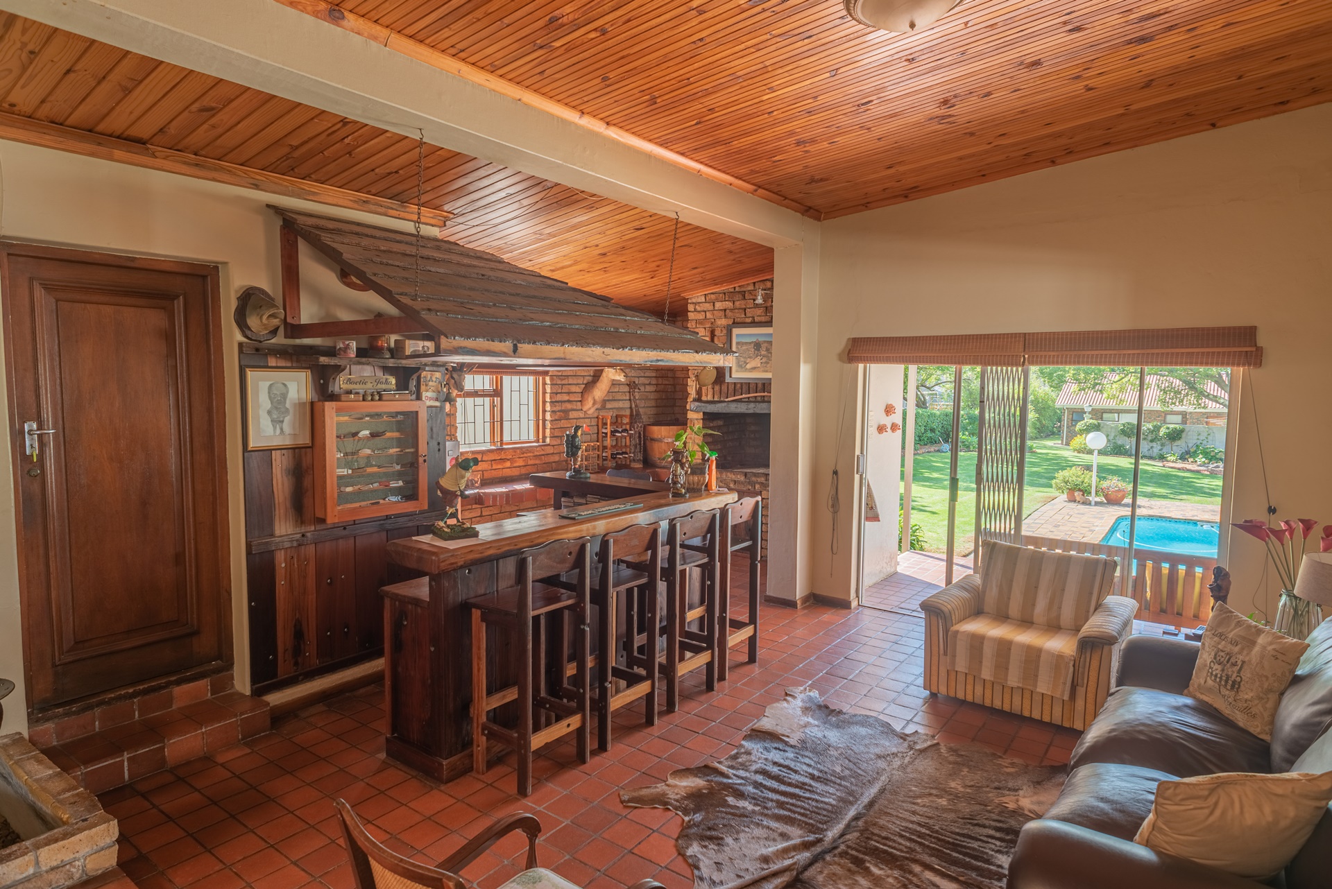 The house has 3 bedrooms and 2 full bathrooms, one en-suite. The bedrooms both have built in cupboards and lead out onto a 2nd lounge/entrance room. The large living area consists of a lounge with a beautiful old fireplace, dining room and bar area which leads out to the paved pool area and beautifully kept garden. The kitchen has loads of cupboards, a double door eye level oven, gas hob, double sink and breakfast nook. The house has a combination of tiled and wooden floors and its high ceilings keep it nice and cool in summer.