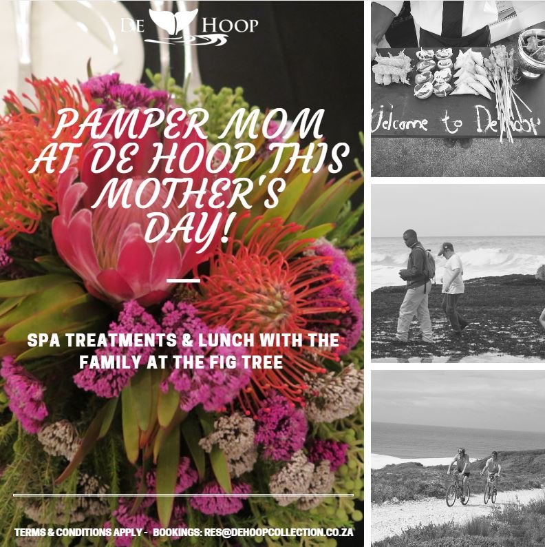 And what about a gift? The Spa at De Hoop has put together a special for moms from the 6-8th May comprising of a blissful 90 minute “African goddess facial” which includes a back/neck massage, for only R600. Moms enjoy a welcome glass of bubbly too, so go on and pamper the special woman in your life next weekend!