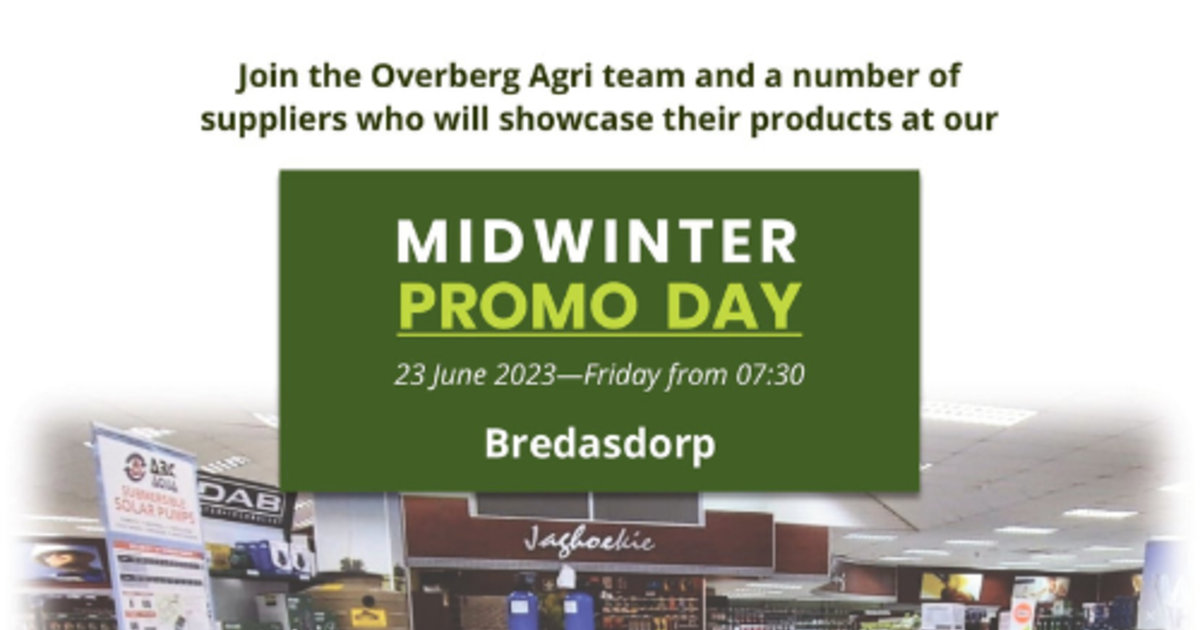 Join the Overberg Agri team and a number of suppliers who will showcase their products at our Mid-Week Promo Day on Friday, 23 June 2023 from 07:30 in Bredasdorp!