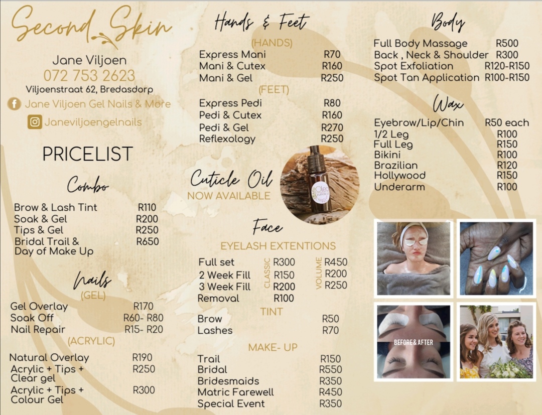Jane Viljoen is the nail art expert in the community transforming your hands into art masterpieces. Her talent and experience reflect in the many creations she has delivered. Whether you are looking for beautiful natural looking nails or want to have fun with something colourful and artistic, Jane Viljoen is able to deliver this professional service. This includes gel and acrylic (full or tips) as well as maintenance of the nails. The beauty salon offers a full spectrum of services including specialised eyelash extensions which is very popular as well as waxing, manis, pedis, tinting, make-up and massages including exfoliation. Second Skin is able to assist brides and bridal entourages with the full spectrum of make-up, nail and beauty needs for the day. Vouchers are also available for that special gift idea for your family members and friends as a special treat.