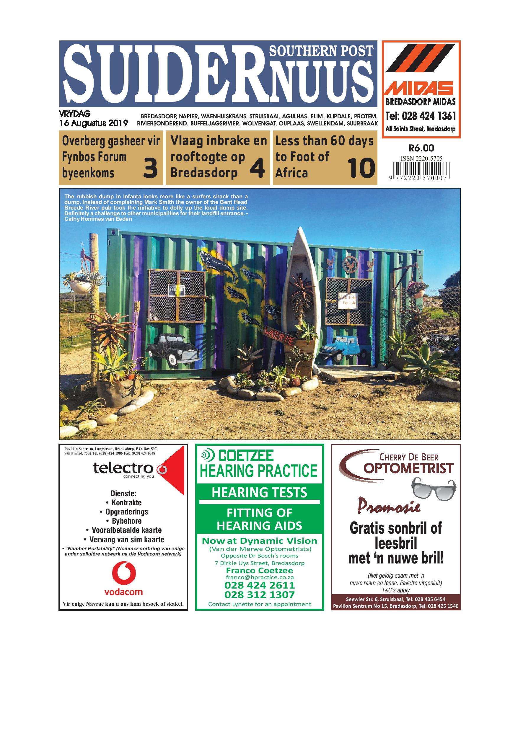 Suidernuus / Southern Post is a well-established Bredasdorp-based publishing and printing company that reaches thousands of readers, across 14 Overberg towns, each week. Other than publishing accurate local news and information, the publishing and printing company provides businesses with the opport...