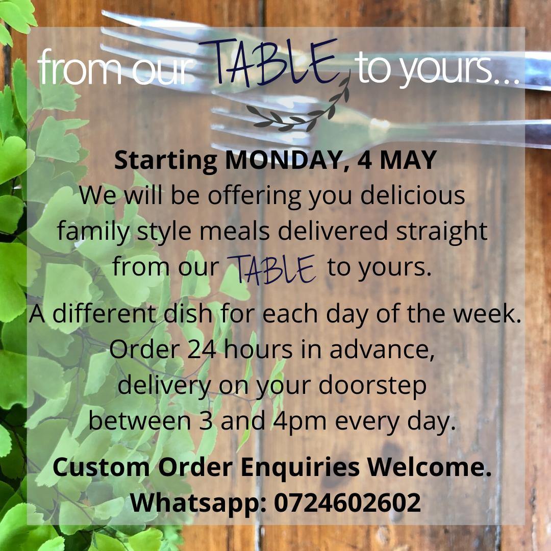 Starting Monday, 4 May 2020 we will be offering you delicious farm style meals delivered straight from our table to yours.