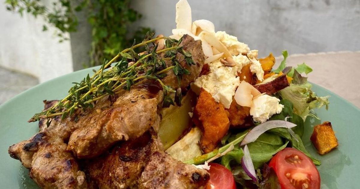 Beer, Thyme and Garlic Marinated Pork Neck Chops on a Roast Butternut, Sweet Potato, Feta and Toasted Coconut Salad.