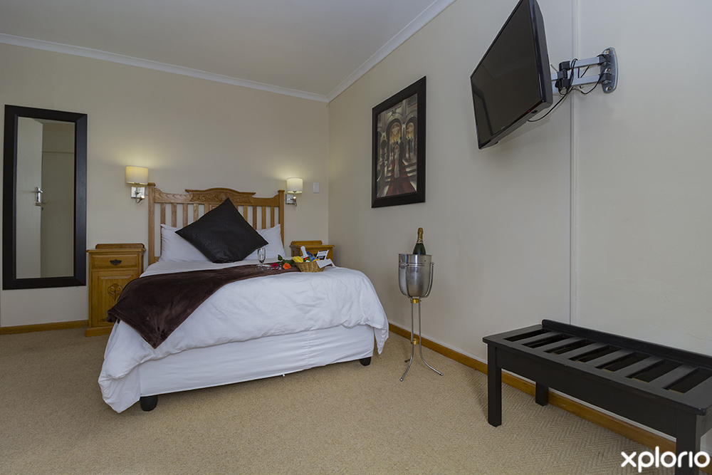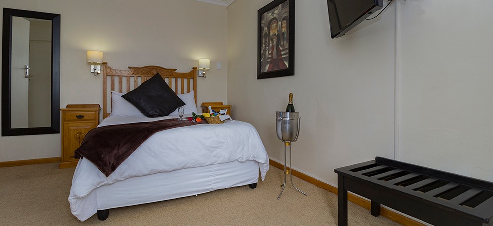 The Super Deluxe Double Room has a double bed and the large ensuite bathroom has a spa bath, a shower, a basin and a toilet.