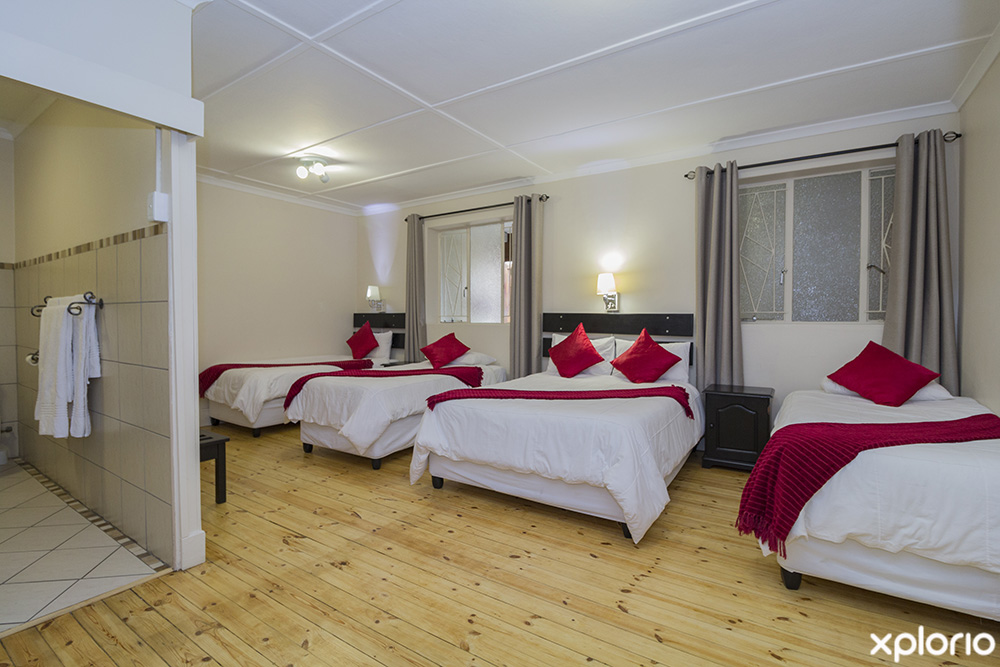 The Deluxe Quadruple Room has one double and three single beds. The ensuite bathroom has a shower, a basin and a toilet.