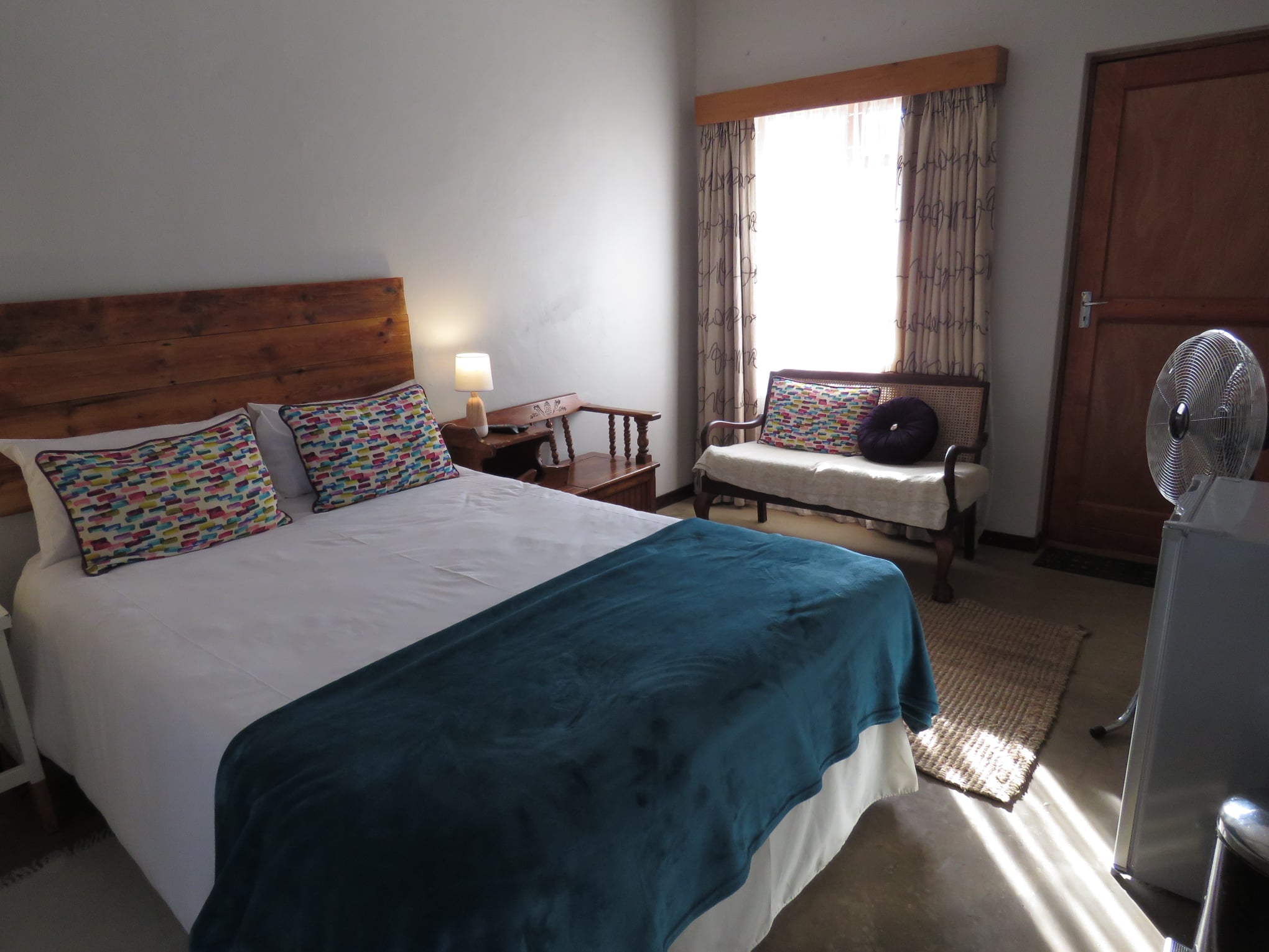 The main cottage has a large sleeping room with a queen-size bed and two single beds in the open plan living area which opens up on the outside courtyard and stoep. It has a private bathroom featuring a large walk-in shower, toilet and basin.