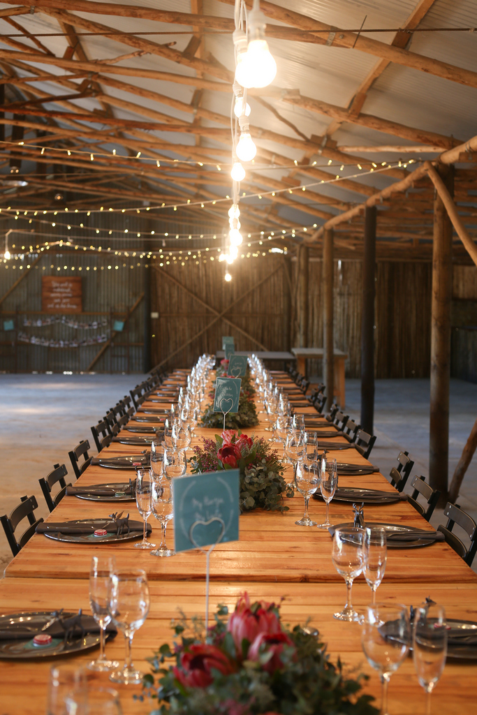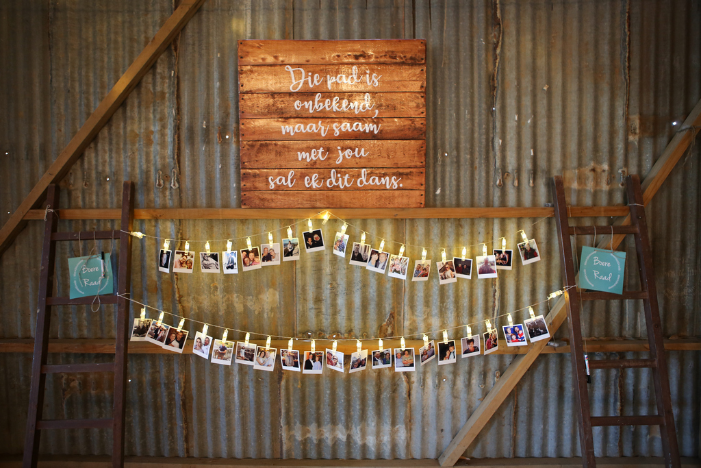 Die tafel name was Afrikaanse volks-liedjies. Die gaste se geskenkies was Takbokkies en Samboksalf. So ongelooflik oulik. Daar was spesiaal n muur uitgesit sodat gaste aan Elaine en Kobus kon boere-raad neer skryf waarna hulle vir ewig kan kyk.