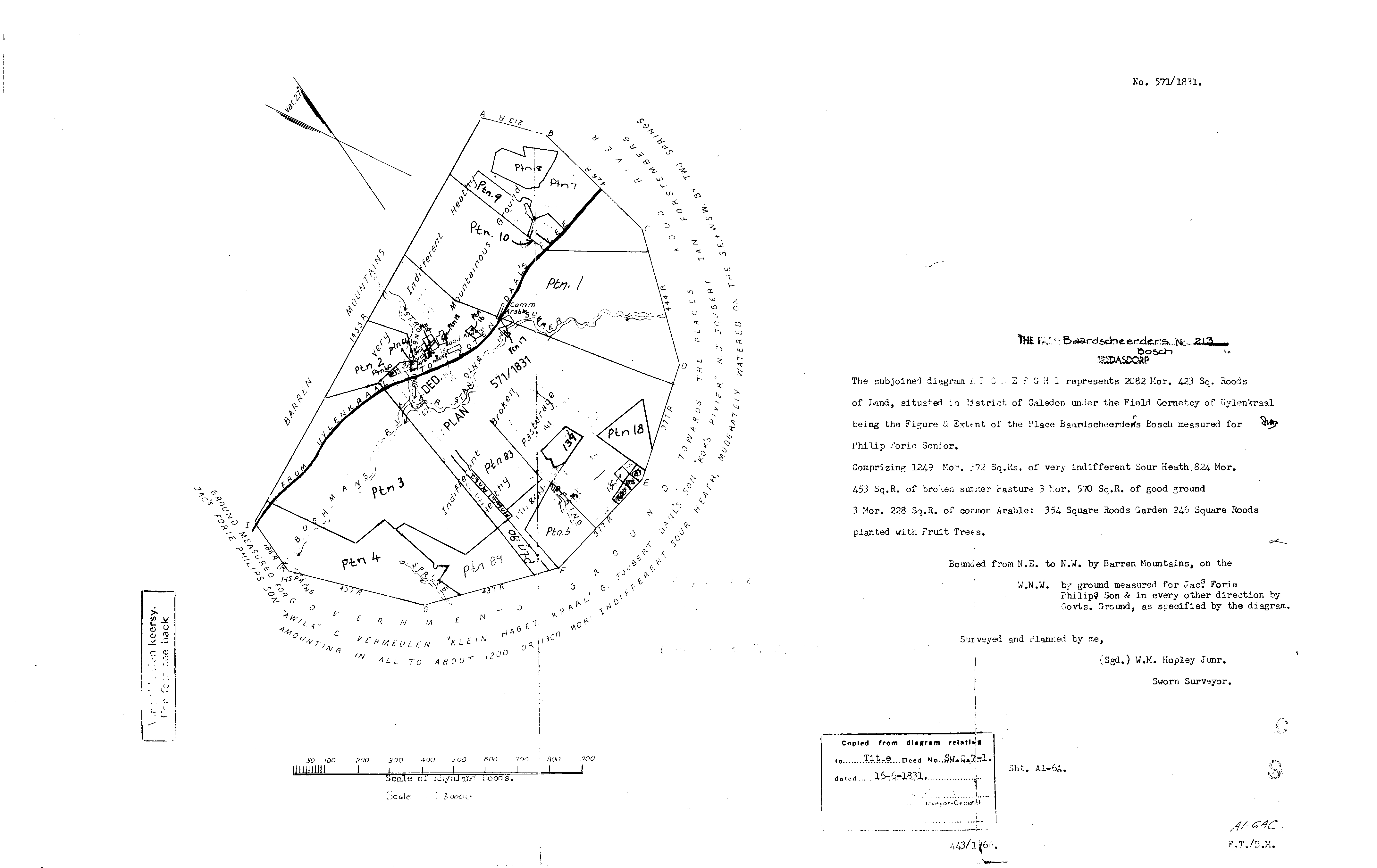 Considering living on a farm in such a remote location with no entertainment, it comes as no surprise that Philip and Petronella (Swart) had 15 children. Eventually, the loan farms could be claimed under the erfpag (2) system and in the survey of 1831 he is indicated as the owner of the farm. Most of his children settled elsewhere in the Strandveld. His third son, Johannes, married Catharina Johanna Groenewald, sister of Wessel Groenewald who was first married to Philip and Petronella’s oldest daughter, Elsabè and then later mention is made that he married the 8th child, also Elsabè (Johanna)! Well, this was not uncommon at the time and in a remote area such as Baardscheerders Bosch, as the opportunities for marriage were limited. Here the families really become intertwined as other sons of Philip married sisters of Wessel. What is important, is that Johannes and Catharina Fourie; and Wessel and Elsabe Groenwald settled on the farm. On 16 June 1831, the first Title Deed is issued to Johannes Fourie and Wessel Groenewald in equal shares. They are now deemed as the first official owners of the farm Farm 213.