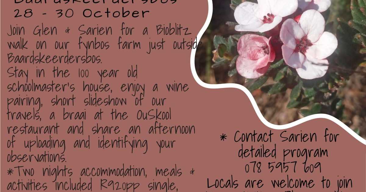 Help us to put Baardskeerdersbos on the bio-map. Overstrand is joining the Great Southern Bioblitz. Spend the weekend in Baardskeerdersbos and join us on our farm for a walk. Accommodation is available.