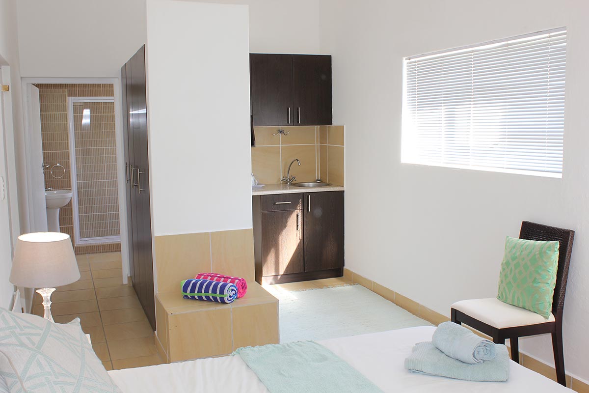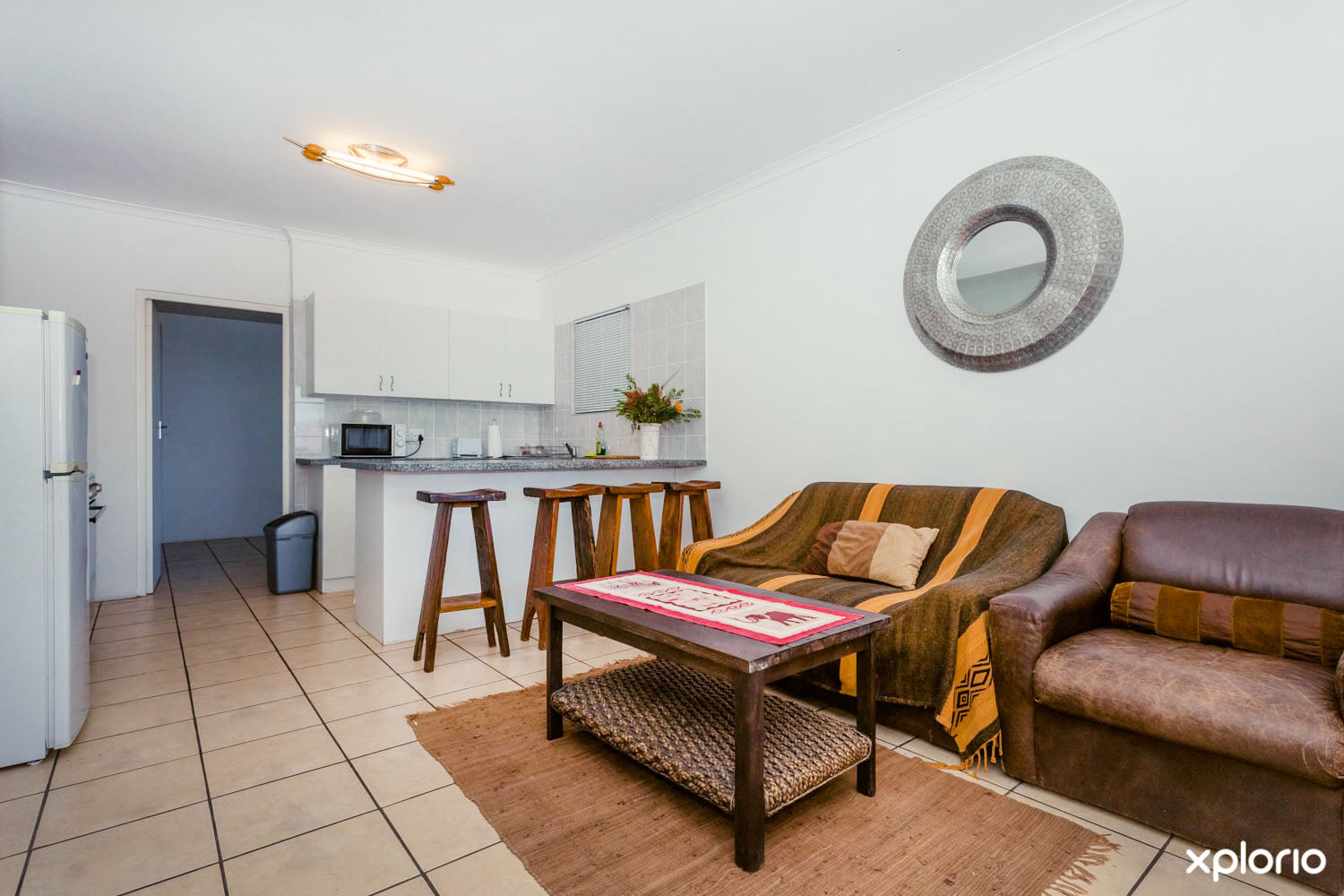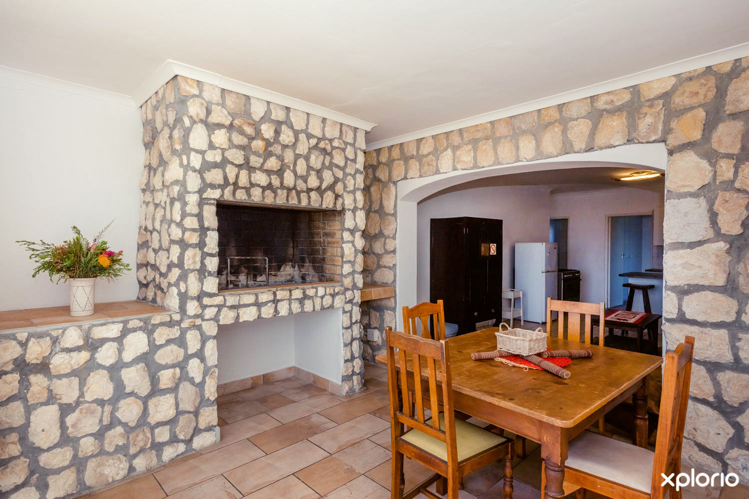The Flat at Stone House boasts scenic views of Walker Bay. An open-plan living area includes a lounge, fully fitted kitchen and an indoor braai area. There are two bedrooms that share a bathroom that has a shower, a basin and a toilet.