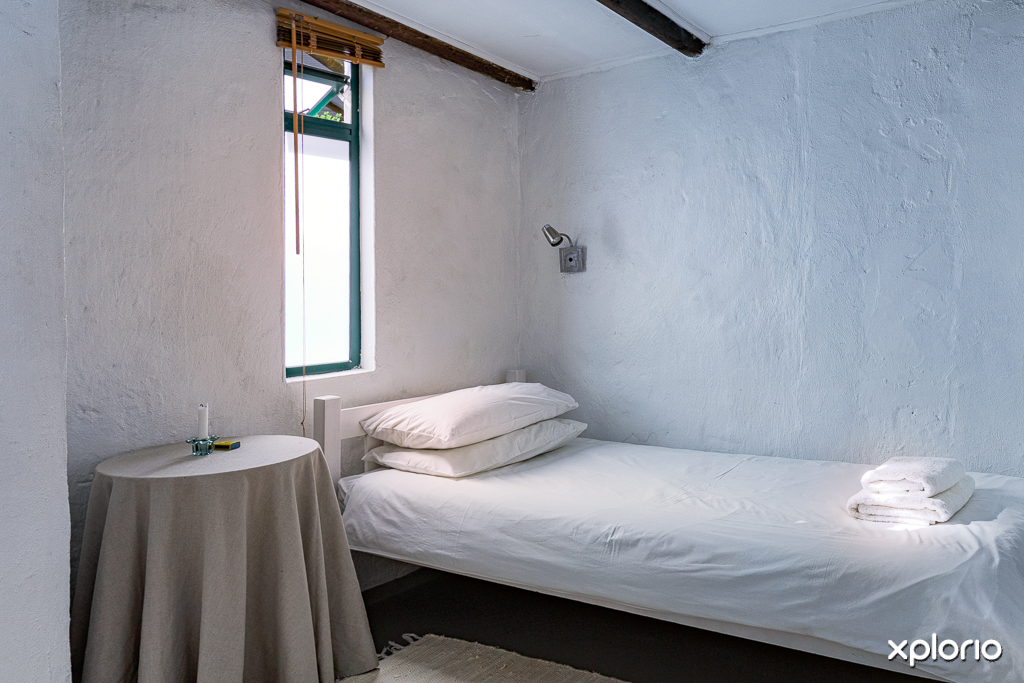 Each room contains a bed, a side table and a small cupboard space for clothing. These rooms lead into an open plan living space that looks out across the gardens and labyrinth.