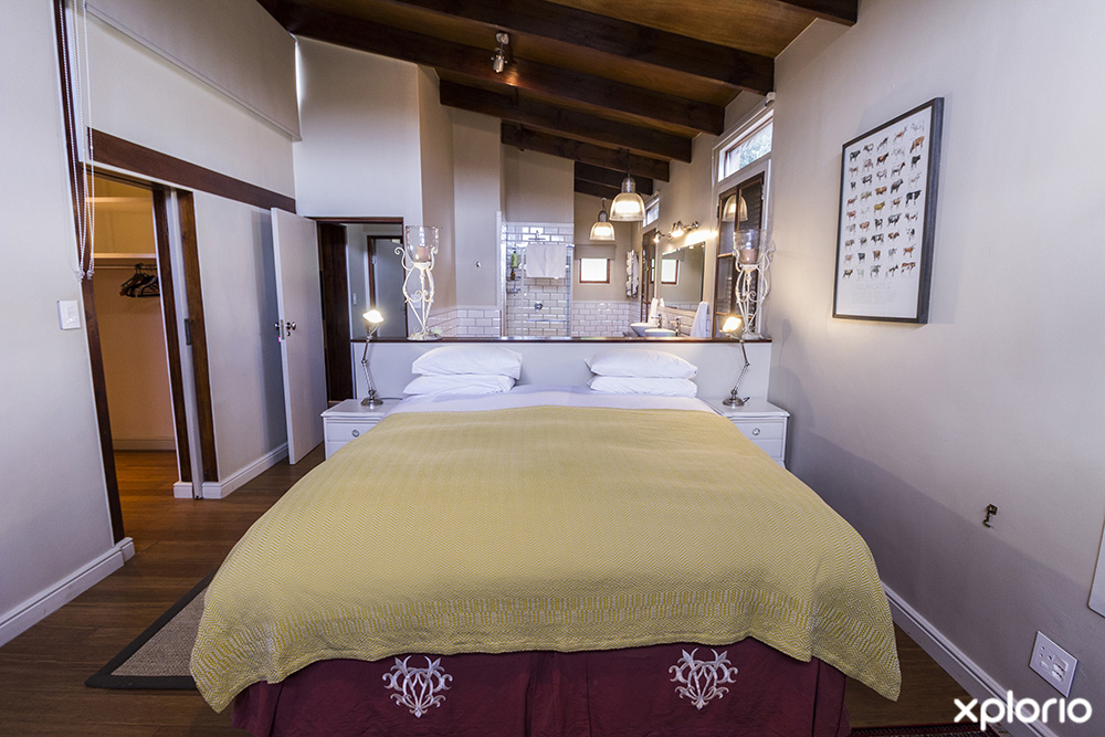 The master bedroom has a King-size bed with an ensuite bathroom that has a bath, shower, basin and toilet.