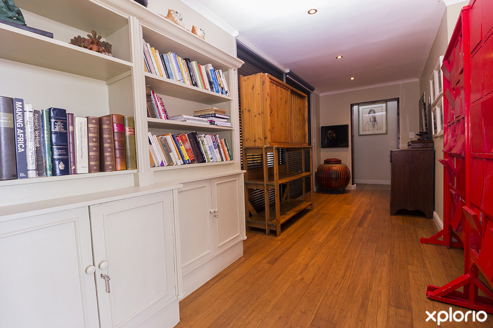 There is a communal area with a kitchenette, dining room table, lounge and library area.