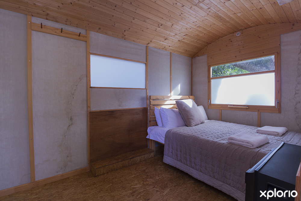 An open-plan room has two single beds while an outdoor caravan suite has a double bed.