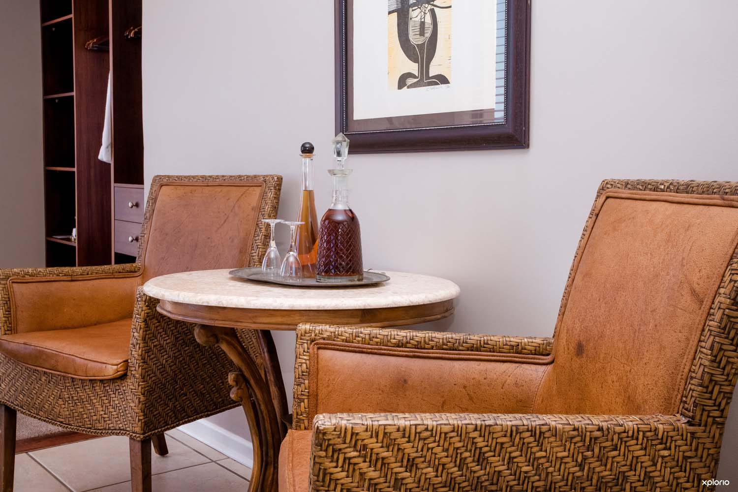 Right next to the pool area outside and downstairs of the guest house, this room is located on the lower level of the Lodge next to the swimming pool. The bedroom has comfortable armchairs and the option of having a king-size bed or twin beds. The en-suite bathroom has a shower, basin and toilet.