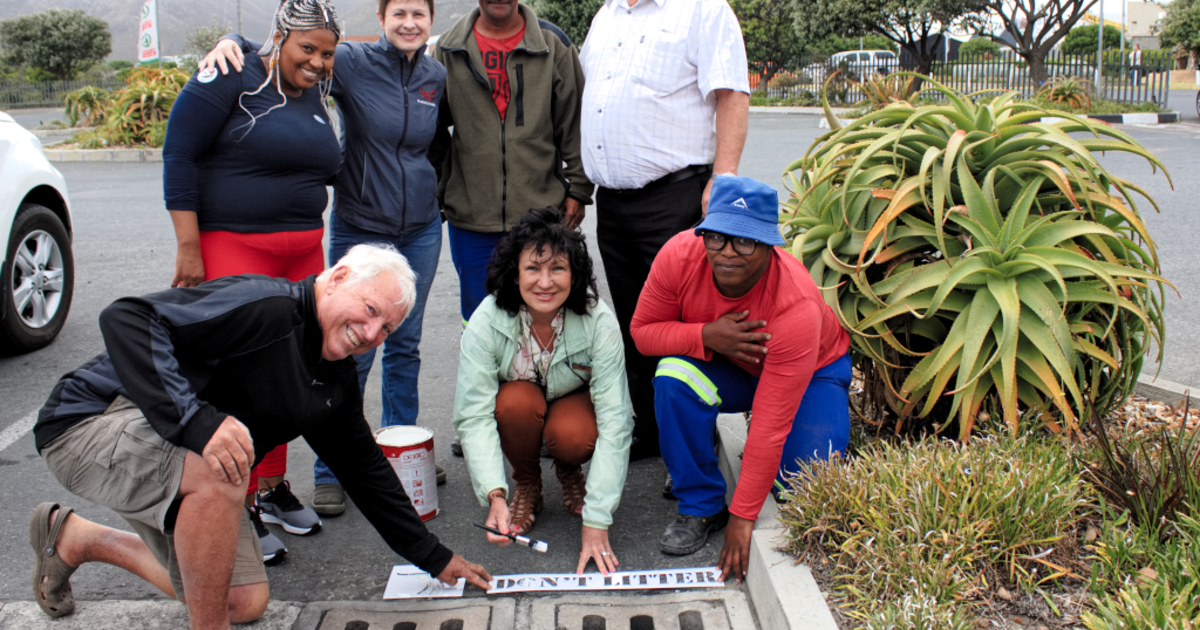 Councillor Riana de Coning and Overstrand Municipality Gansbaai Manager Francois Myburgh met with the Trust representatives Pinkey Ngewu and Brenda du Toit, to place stencils on the drains in town with a message of “Don’t Litter. The Sea Starts Here.”