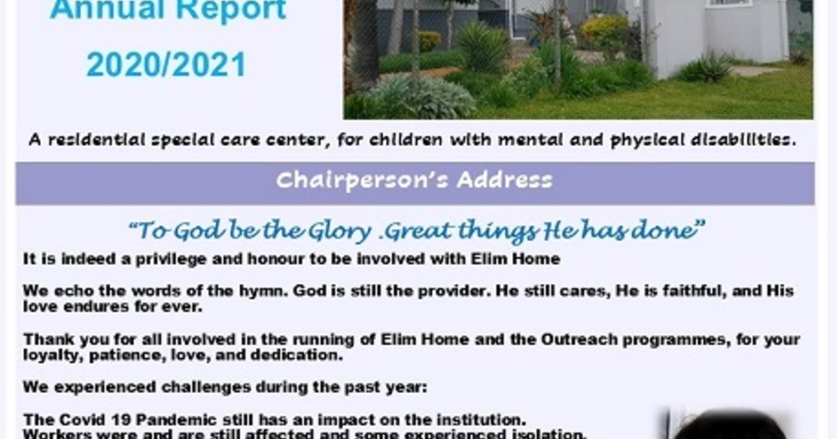 Elim Home is a special care facility in the historical Moravian mission station town of Elim, just outside Gansbaai. The home is dedicated to providing optimal care for children and young adults with severe intellectual and physical disabilities that range from Down’s Syndrome to severe Autism. Fo...