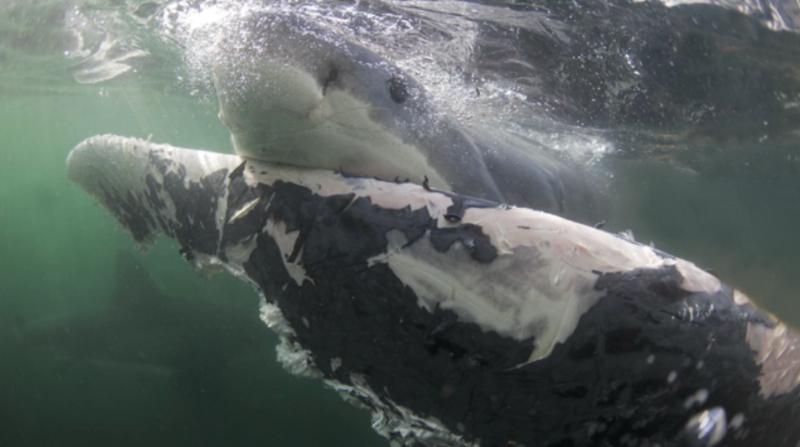 Great White Shark scavenges in groups. Rarely venturing too close to the coast, these apex hunters have now been found to cruise closer for a fatty treat.