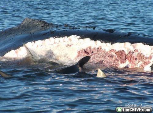 start at the fluke and work their way through the carcass, biting off pieces, swallowing and sometimes regurgitating it and biting off a different piece.