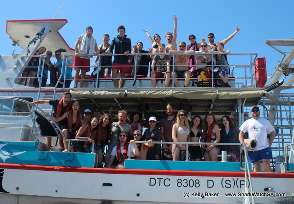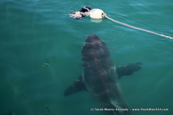 It was another 9 AM launch for Slashfin and as we headed out to sea we hoped that the white sharks would come visit today. The bay was flat with the sun shining overhead and a light south easterly breeze keeping the temperature cool. We didn't have to wait long before we had a visitor, a large copper shark that curiously swam back and forth in front of the cage as thousands of Cape Cormorants flew by in the distance, with some coming within 10 meters of the boat.