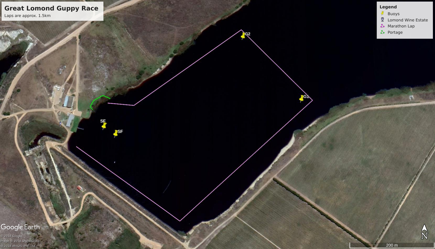The route for the Guppy race will be the same fast start along the dam wall followed earlier by the geriatric mob. After the sprint, turn left around the fish tanks and then head up along the bank to the first buoy. Left at the buoy and head across the dam - safety boats will be in attendance - to the second buoy. Another left and paddlers will be on the home straight. U8 head for the finish line. U10 and U12 cut in at the portage to enjoy the cheers of the adoring spectators! U10 will complete one more lap and U12 need to tough it out for another two. Laps are 1.5km long giving total distances of approx. 1.5km, 3km and 4.5km for each race.