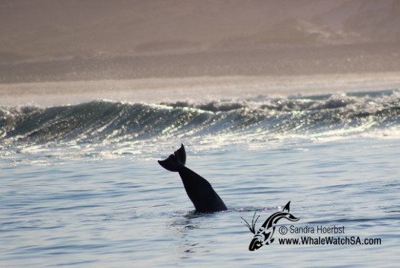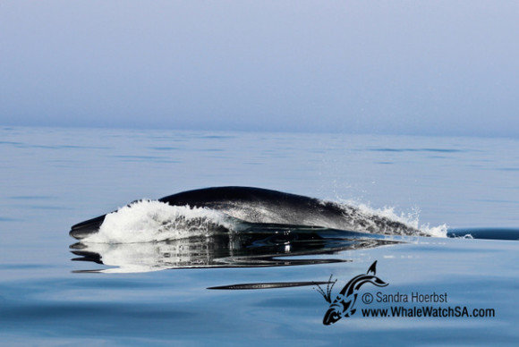 First we spotted some African penguins and one of our clients did spot a blow, so we stopped the boat and had a closer look. And yes, she was right, there was a whale so we slowly approached and got to see a Bryde’s whale with her calf traveling towards Quin Point. While busy watching the whales traveling alongside our vessel we spotted some splashes a bit further off. What is it? So we left the mother and calf pair behind and were amazed by what we got to see. It was a Dwarf Minke whale (Balaenoptra acutorostrata subsp.) porpoising at a speed of 20km/h.