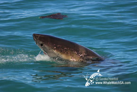 The morning trip started out a little choppy, but after searching a little towards Danger Point, we went over to Geyser Rock to see the Cape Fur Seals. After leaving the seal colony we headed towards Pearly Beach to look for whales and very quickly found 2 Southern Right Whales, which was mother and calf pair. On the way back to the harbour we stopped by the shark cage diving boats and got to see a Great White shark come very close to our boat as it swam by.