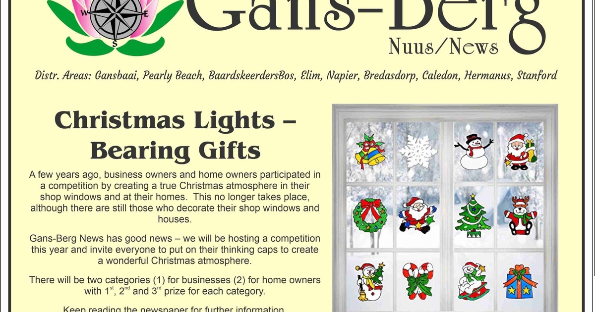 Gans-Berg Nuus is a weekly bilingual community newspaper serving Gansbaai and the surrounding Overstrand areas. With a front page that alternates between Afrikaans and English each week, Gans-Berg Nuus / News is proud to be a platform that stays up to date with local news stories, important municipa...