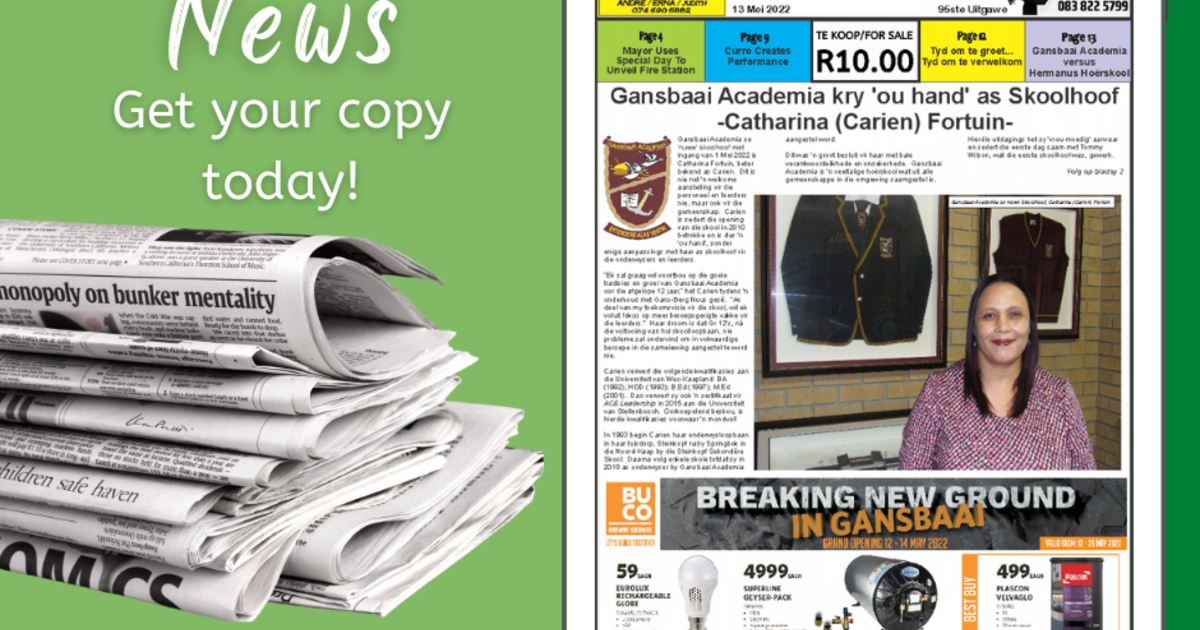 Don't forget to get the latest copy of the Gans-Berg Nuus / News today, 13 May 2022 for ONLY R10!