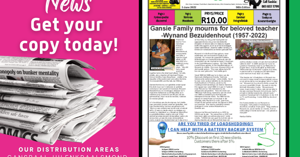 Don't forget to get the latest copy of the Gans-Berg Nuus / News tomorrow, 3 June 2022 for ONLY R10!