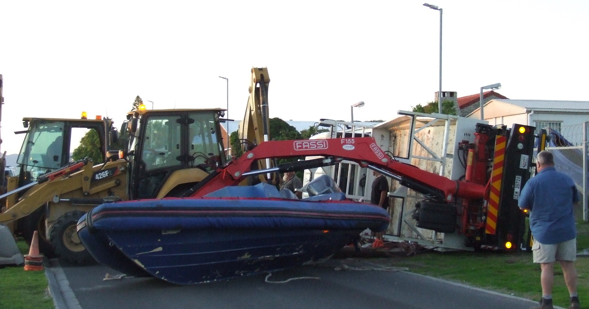 ‘n Hyskraan is gebruik om die boot van die vragmotor af te lig en aan die anderkant van die heining te laat sak. Dis waar die probleem toe begin. Die staal stut-arms van die hyskraan het in die nat grond ingesak en die gewig was te veel - die gevolg was dat die vragmotor omgeval het en op sy sy beland het.