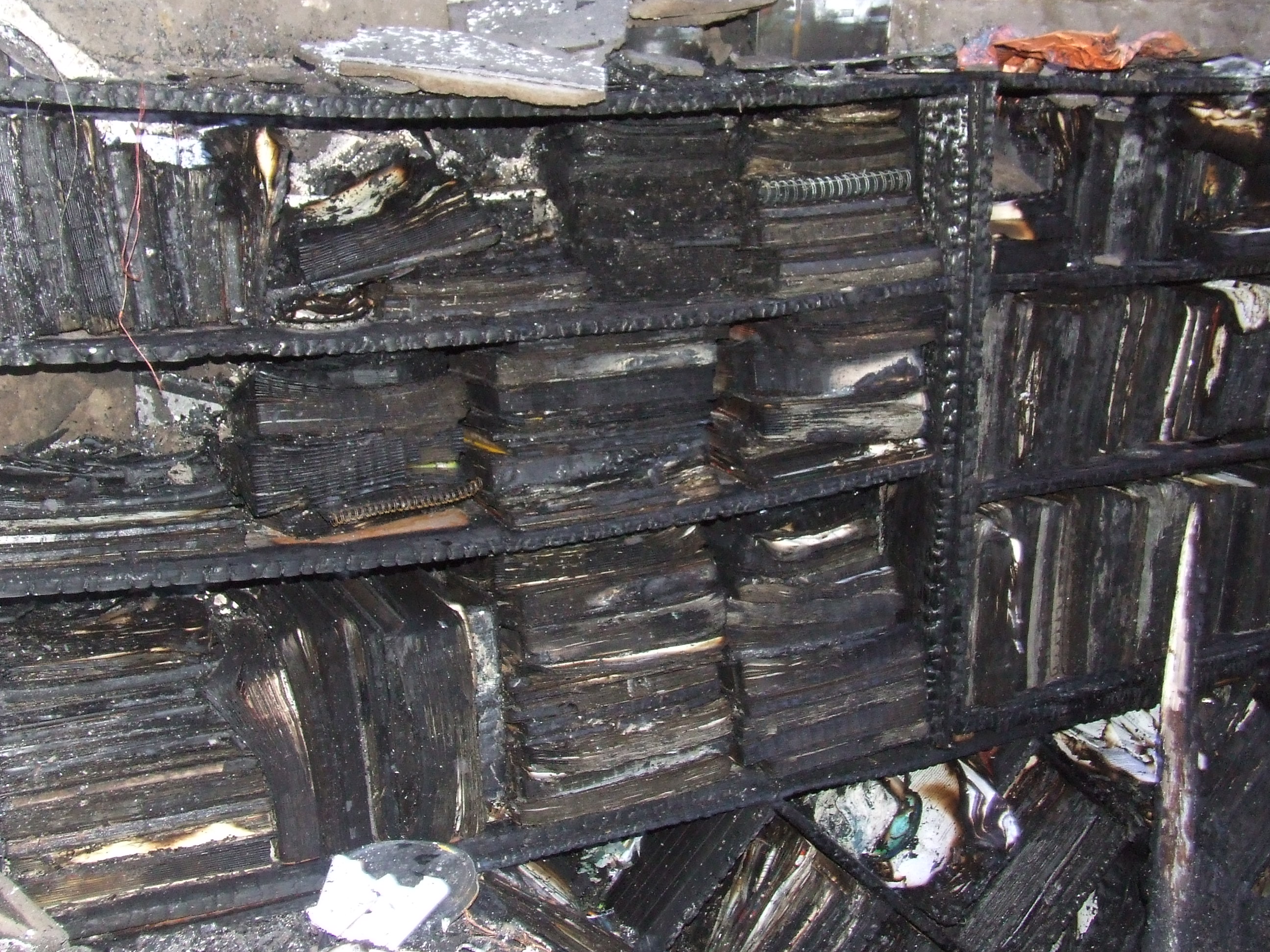 Die studeerkamer is ‘n diep-hartseersaak vir altwee die dames. Hulle onderskeie beroepe is alles op aanlynwerk gebaseer. WiFi-kabels, jare se kosbare en onvervangbare boeke, lêers, dokumentasie, CD’s met inligting, ‘honderde’ foto’s met sentimentele waarde, skilderverf en -doeke (canvas), die drukker - te veel om hier te noem is verbrand. Selfs die pleister aan die mure in die studeerkamer, het afgeval.
