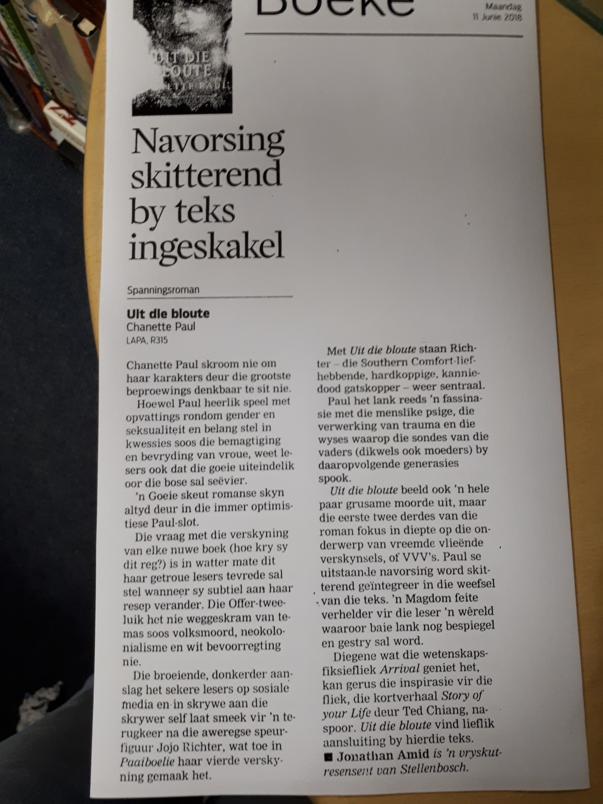 Chanette has lived with her partner in Stanford for the past fifteen years. She loves the research process when working on a book and once she has a story she can write fairly quickly. The most books she has written in a year is six. Chanette wrote Uit die Bloute in nine months. Of course, her retreat to her secret place for a few weeks at a time helps this process. Whilst she has written many a romance novel, her latest books fall into the suspense genre. Fascinated by relationships and character, Chanette considers herself an organic writer who does not know from the outset where the characters will take the story. As such the truth often emerges at the end of the book. "The story must just unfold otherwise my creative juices run dry. How the characters play the game with one another is fascinating," says Chanette. "I trust my readers and my readers trust me and this allows me to take risks with my writing like I have done in Uit die Bloute. People who believe in the extraterrestrial have always fascinated me and the book relates to real phenomena as discovered in my research." Heino added that the research, in this case, was faultless.