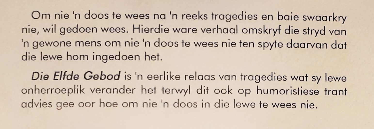 Die Elfde Gebod met Gerhard Ras - 'n Eerlike relaas van tragedies wat ’n mens se lewe van “hero” na “zero” verander, hoe hy in die klem van ellende gespartel het om te bly lewe, hoe hy opgestaan het en besluit het om nie ‘n doos te wees nie en op humoristiese wyse advies te gee om nie die lewe te ernstig op te neem nie.'