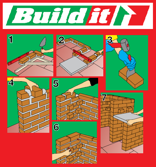 Make a wooden frame to act as a template guide to the dimensions of the grill kit. Lay the bricks out dry (without mortar) to enable the correct brickwork bond to be determined. Bed the bricks on a bed of mortar made up of 5 parts soft building sand to one part of cement, with plasticizer added to keep the mix supple.