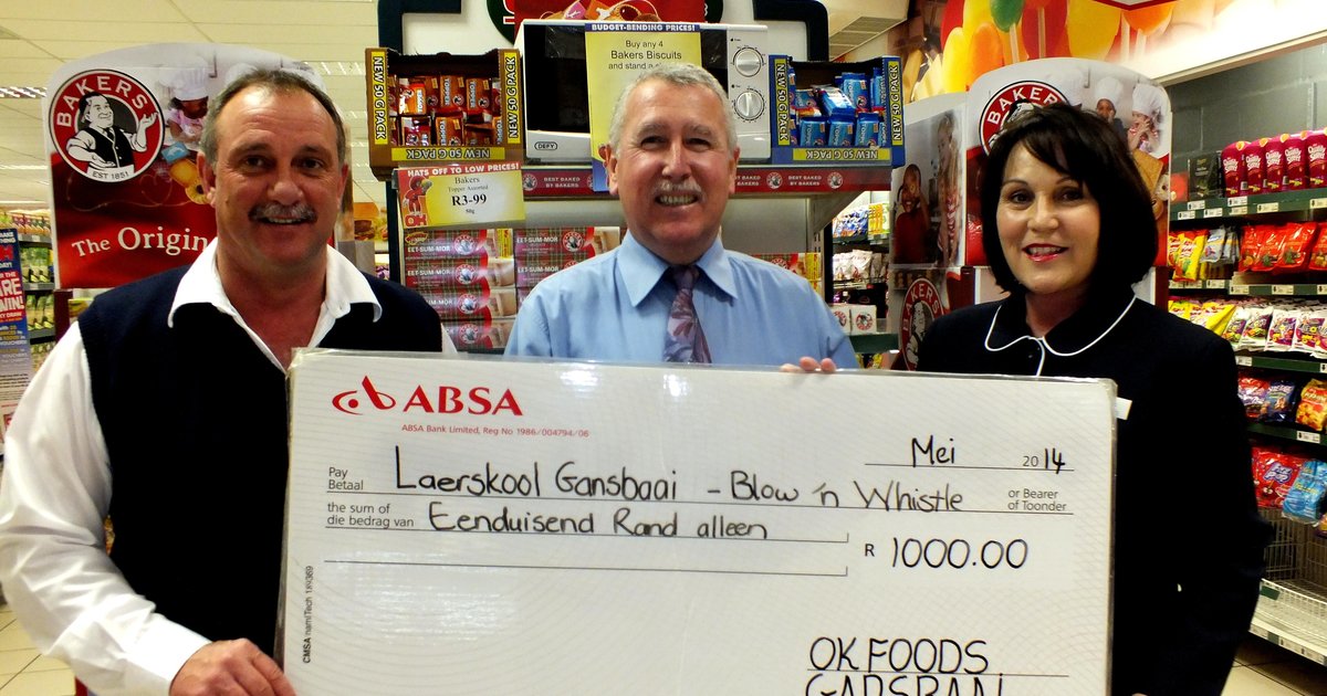 In ‘n skrywe aan onder andere Gansbaai OK Foods, is die versoek gerig dat die Bestuur dit sou oorweeg om van die fluitjies vir hulle personeel aan te koop, of om ‘n donasie te maak ten opsigte van die aankoop van fluitjies vir leerders wat dit nie self kan bekostig nie. Gansbaai OK Foods se eienaars, Chris en Petra van Rensburg, het besluit om ‘n ruim bydrae van R1,000 te maak. Hierdie bydrae is alleenlik bedoel vir leerders wat nie self fluitjies kan bekostig nie. Op 12 Mei 2014 het mnr Van der Merwe persoonlik die tjek ten bedrae van R1,000 in ontvangs kom neem en sy opregte waardering daarvoor uitgespreek..