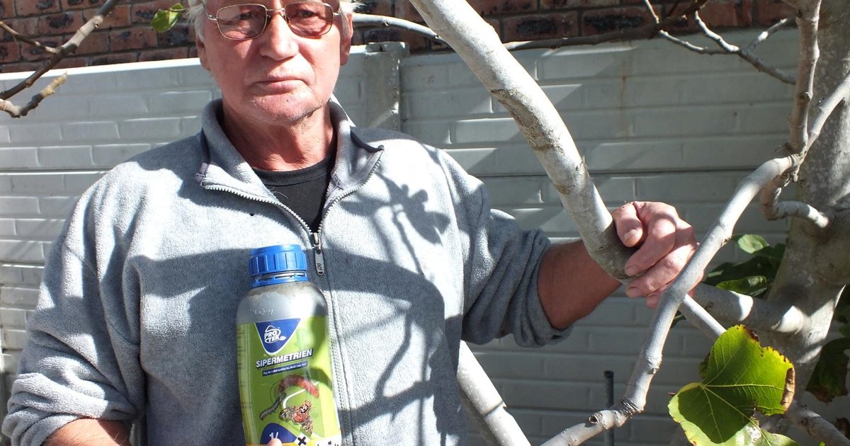 Foto: Eddie Munnik van Pearly Beach by sy gesonde vyeboom, met die insekdoder Sipermetrien in sy hande