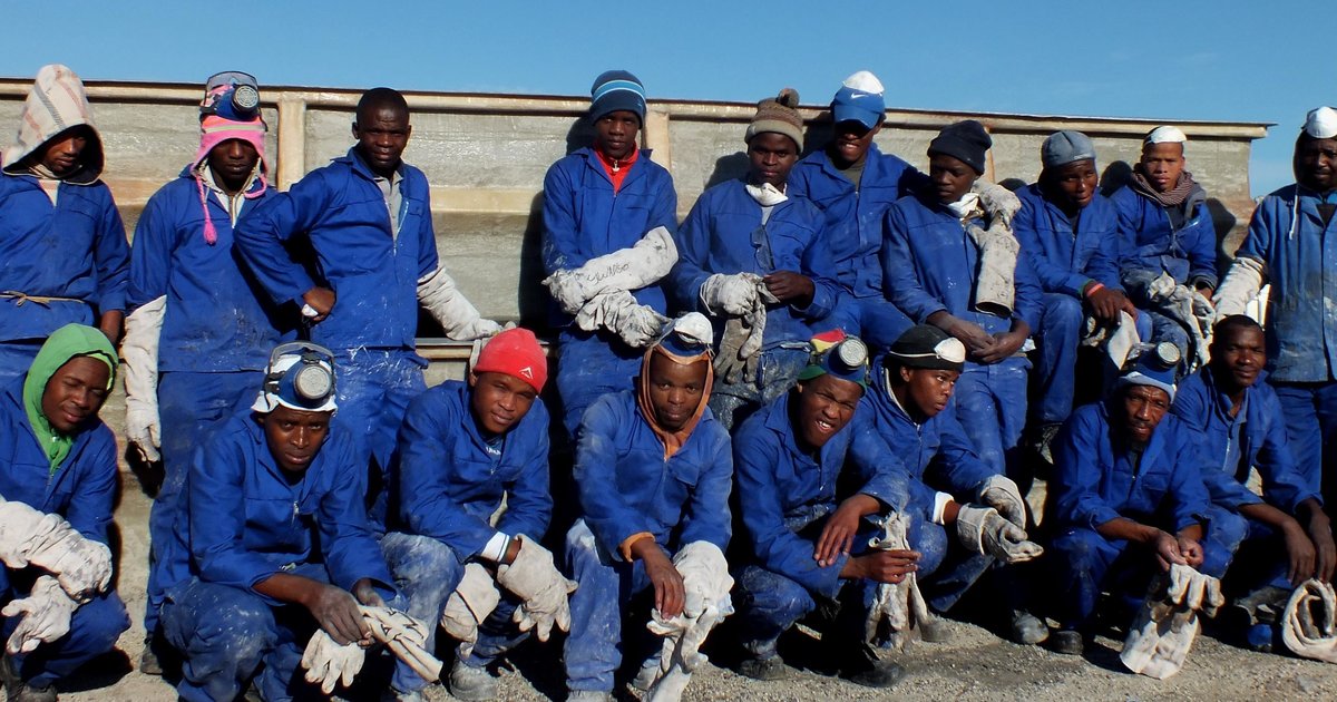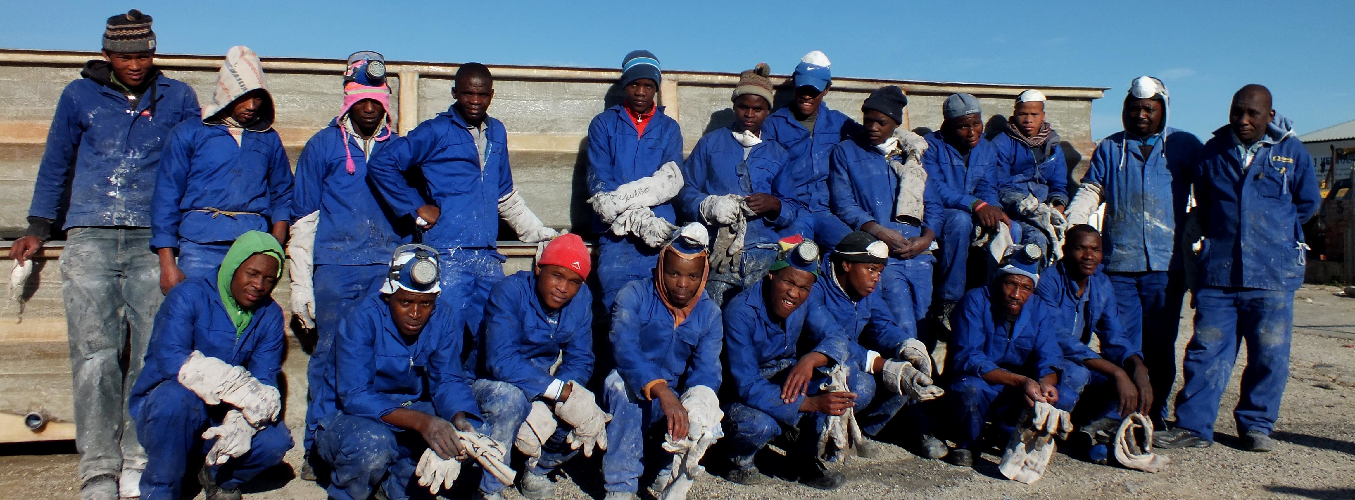 Foto: ‘n Deel van die groep werkers van Omega Ondernemings wat baat vind by Perlemoenplaaskontrakte, by die “Grow-out”-tenks wat hulle plaaslik vervaardig word