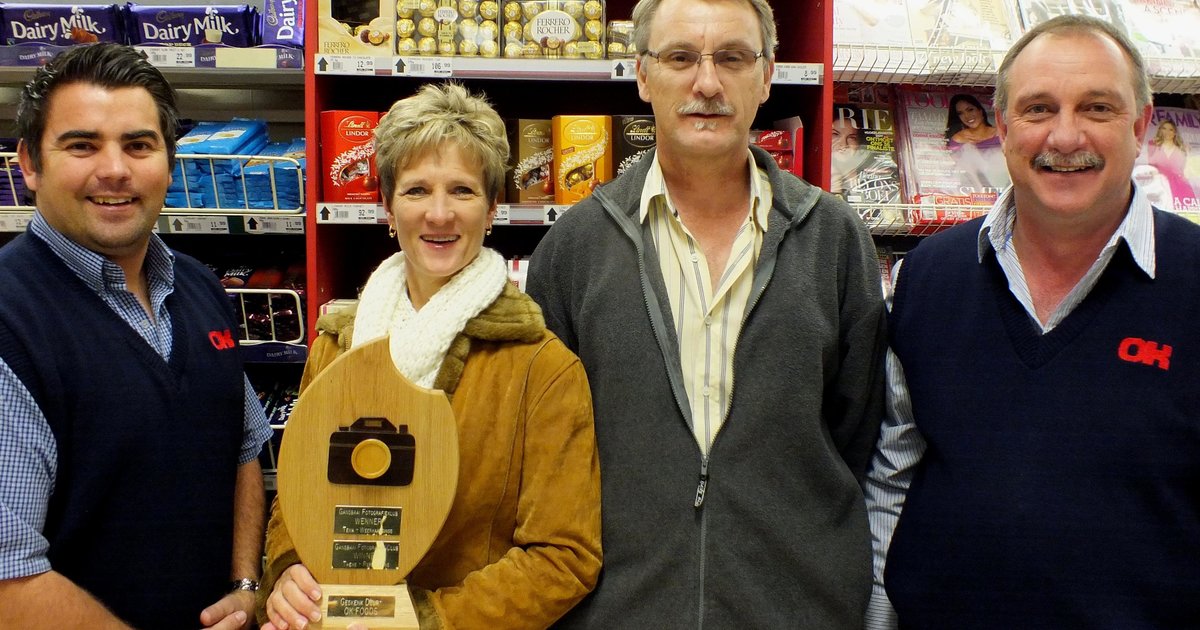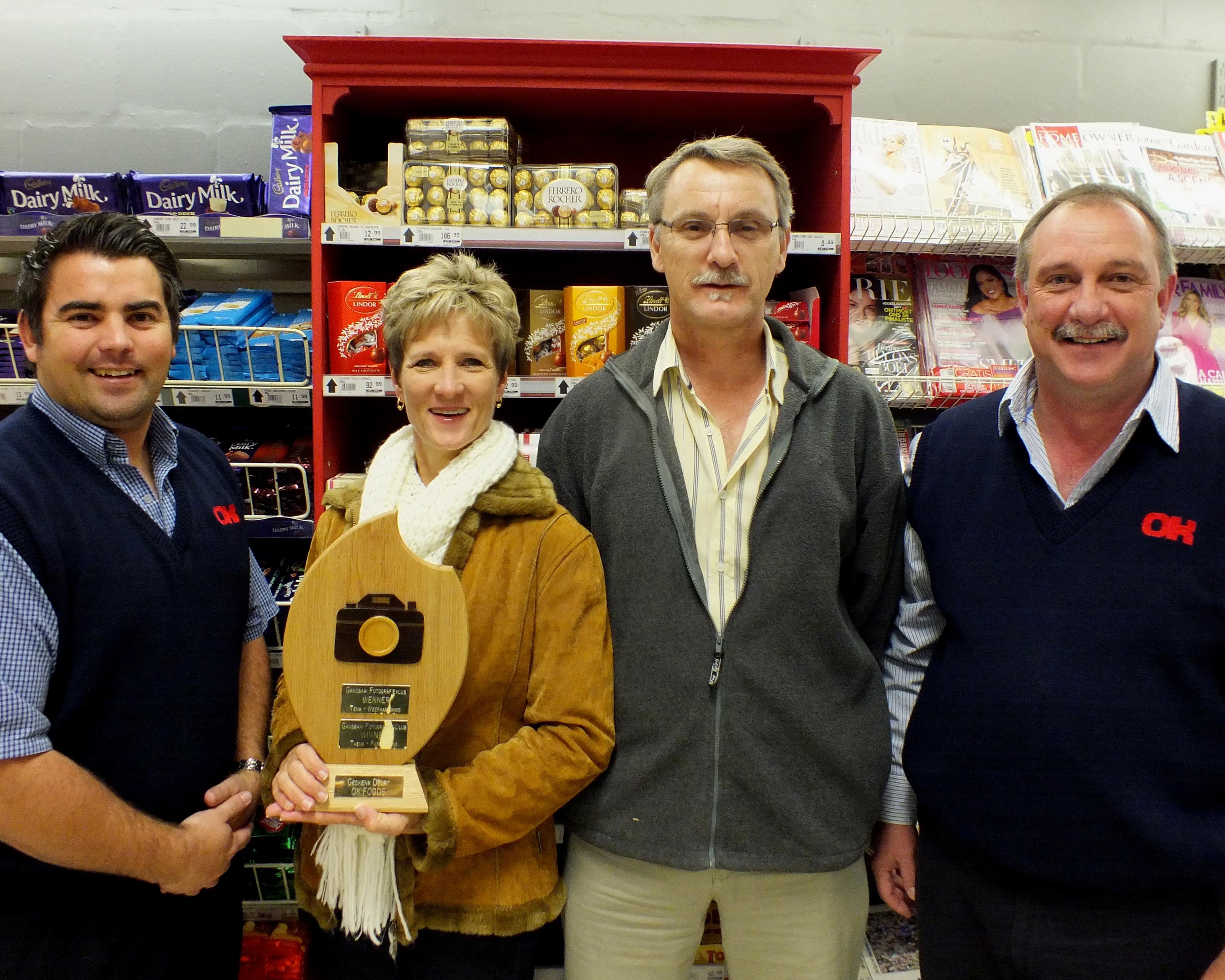 Foto: Vlnr is Gideon Jansen van Vuuren, Linda Kloppers (wenner), Christo Wessels (voorsitter) en Chris van Rensburg tydens die oorhandiging van die Gansbaai OK Foods Wissel Trofee aan Linda.